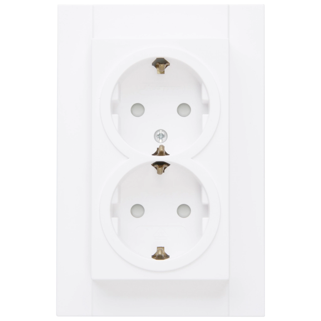 Kopp dubbel stopcontact met randaarde en kinderbeveiliging, HK07, kleur: arctic wit mat (RAL 9016). Geschikt voor een enkele (ronde) inbouwdoos.