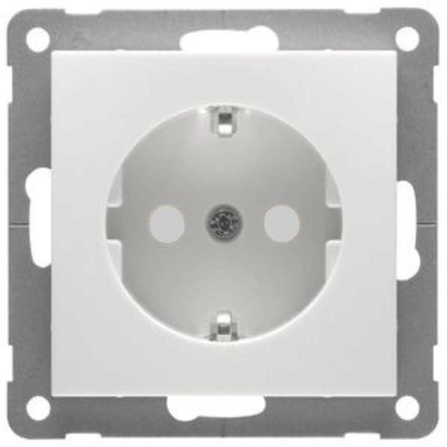 Stopcontact met beschermingscontact (randaarde) en verhoogde aanraakbeveiliging. (kinderbeveiliging) 16A 250V AC. Bedrading aansluiten middels insteekklemmen, aders tot 2,5mm2. Serie: Badora. Kleur: levend wit (RAL9010).
