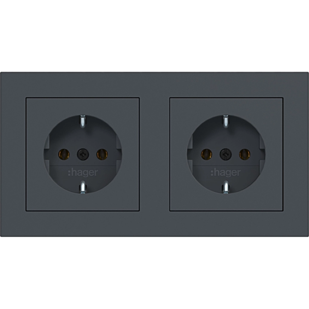 Hager Berker dubbel stopcontact met randaarde, voorbedraad en incl. afdekraam A.1, antraciet mat. Geschikt voor tweevoudige (duo-)inbouwdoos, past niet in twee enkele inbouwdozen. Met klauwbevestiging (spreidklemmen).