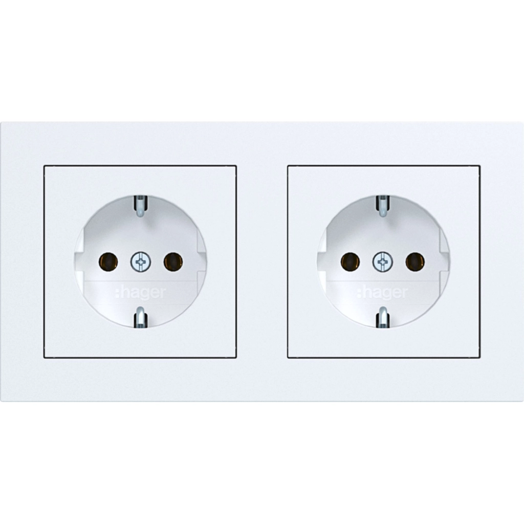 Hager Berker dubbel stopcontact met randaarde, voorbedraad en incl. afdekraam A.1, lichtwit mat. Geschikt voor tweevoudige (duo-)inbouwdoos, past niet in twee enkele inbouwdozen. Met klauwbevestiging (spreidklemmen).