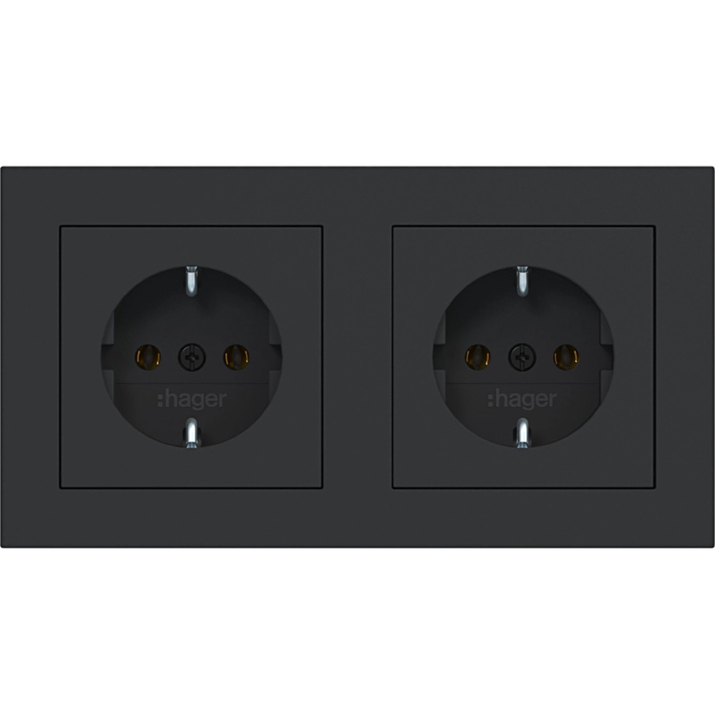 Hager Berker dubbel stopcontact met randaarde, voorbedraad en incl. afdekraam A.1, nachtzwart mat. Geschikt voor tweevoudige (duo-)inbouwdoos, past niet in twee enkele inbouwdozen. Met klauwbevestiging (spreidklemmen).