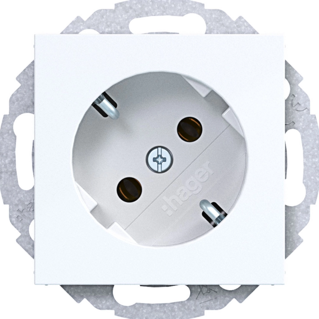 Hager Berker randaarde stopcontact met 45° gedraaide stekkerstand, A.1/A.8/C.1/C.8, lichtwit glans. Met klauwbevestiging/spreidklemmen. Excl. afdekraam.