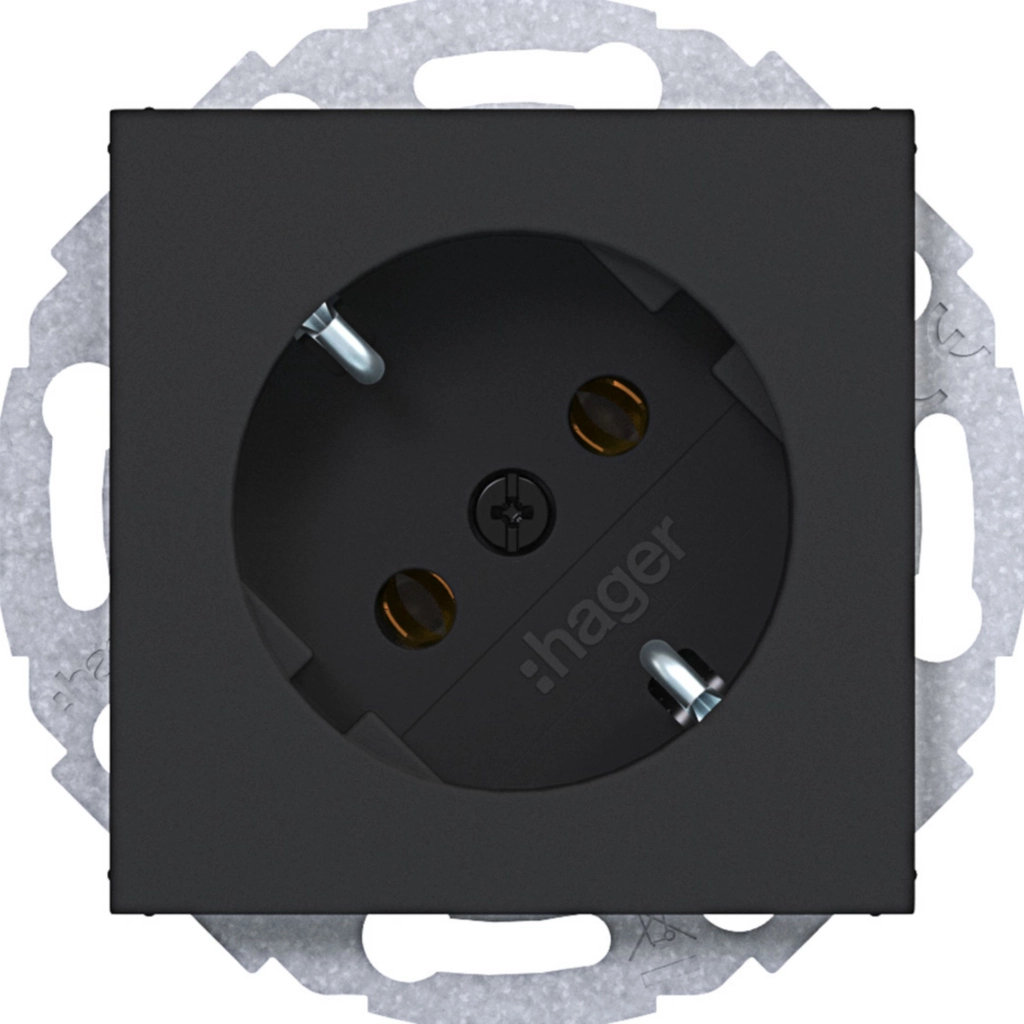 Hager Berker randaarde stopcontact met 45° gedraaide stekkerstand, A.1/A.8/C.1/C.8, nachtzwart mat. Met klauwbevestiging/spreidklemmen. Excl. afdekraam.