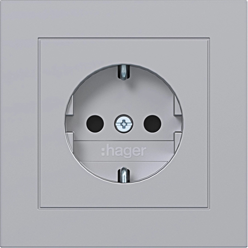 Hager Berker randaarde stopcontact met verhoogde aanraakbeveiliging en volle afdekplaat, voor afzonderlijke montage. Met klauwbevestiging/spreidklemmen. Incl. afdekraam A.1, titaan metallic. Gelakt thermoplast.