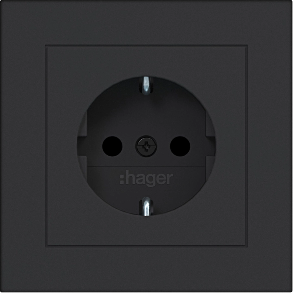 Hager Berker randaarde stopcontact met verhoogde aanraakbeveiliging en volle afdekplaat, voor afzonderlijke montage. Met klauwbevestiging/spreidklemmen. Incl. afdekraam A.1, nachtzwart mat.