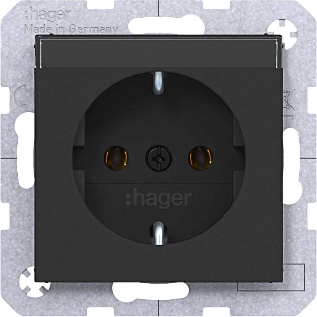 Hager Berker randaarde stopcontact met tekstveld, A.1/A.8/C.1/C.8, nachtzwart mat. Met klauwbevestiging/spreidklemmen. Excl. afdekraam.