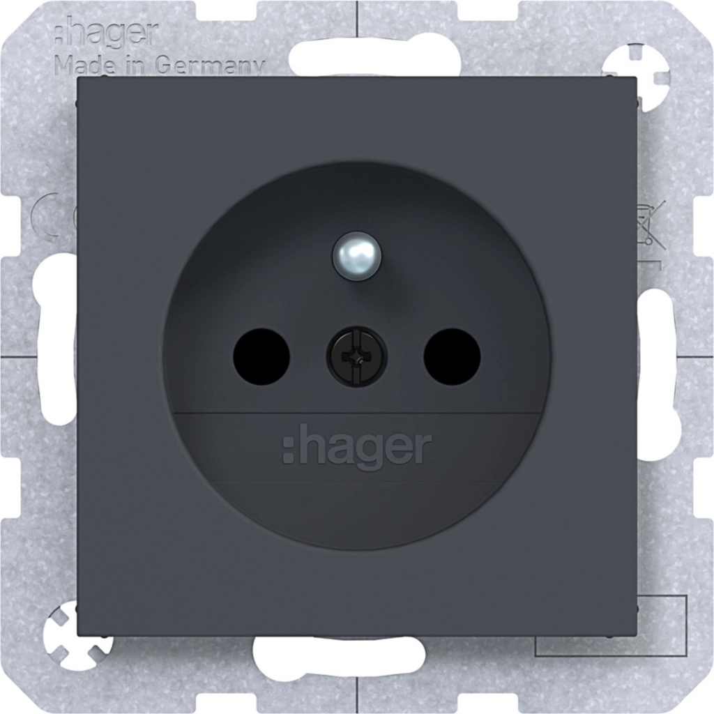 Hager Berker stopcontact met penaarde (België) en verhoogde aanraakbeveiliging, A.1/A.8/C.1/C.8, antraciet mat. Met klauwbevestiging/spreidklemmen. Excl. afdekraam.